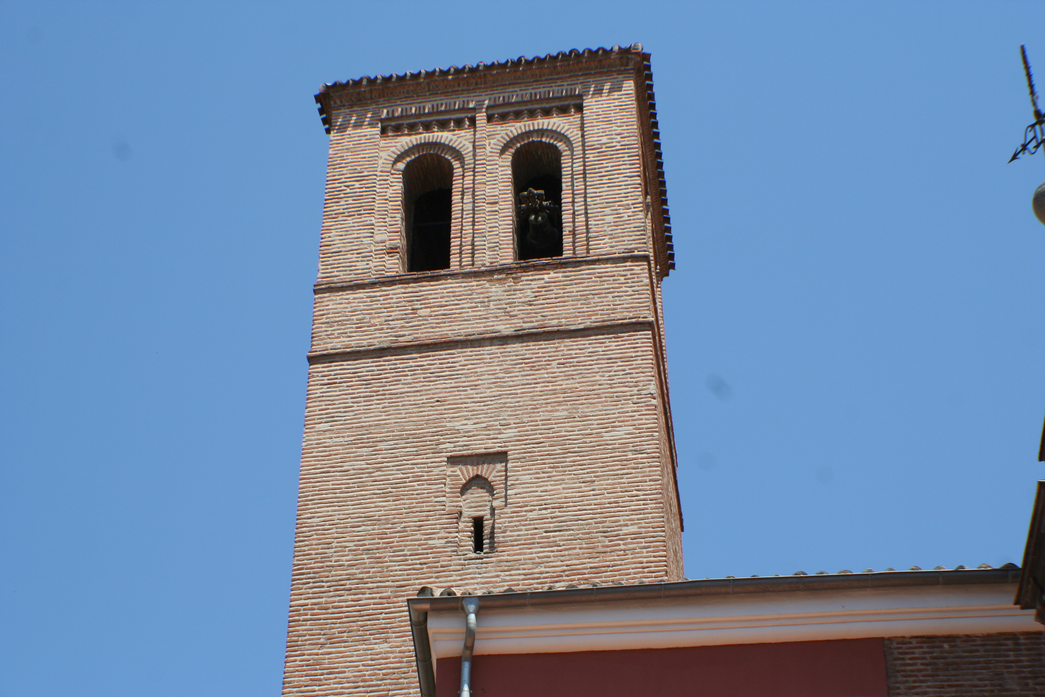 La torre mudejar de ladrillo posee 30 metros de altitud. Fue construida en el siglo XIV. Posee un aspecto solemne, aunque las ventanas ayudan a relajar el aspecto de amasijo de ladrillos. Las ventanas son de herradura apuntadas en sus arcos y están enmarcadas por un alfiz. El cuerpo de campanas, con doble abertura a cada lado, es de estilo mudejar, aunque se realizaron en 1769 por Felipe González.