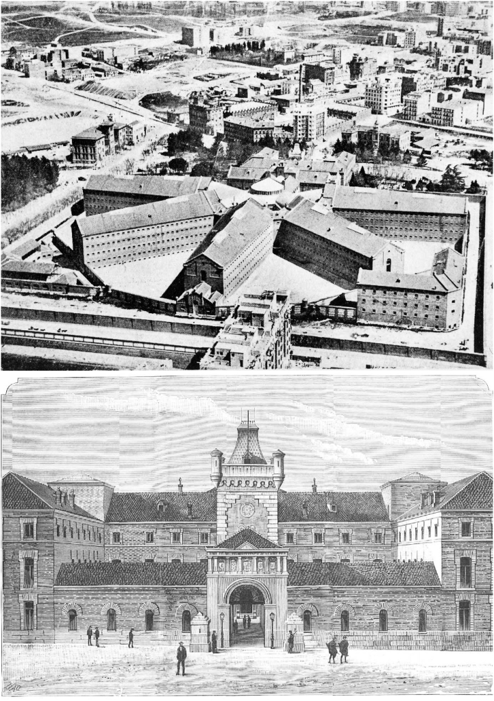 Las obras comenzaron en 1877 bajo la dirección de los arquitectos Tomás Aranguren y Eduardo Adaro, y la cárcel fue inaugurada oficialmente en diciembre de 1883. El edificio ocupaba una extensa manzana en las inmediaciones de Moncloa, entonces una zona todavía poco urbanizada. Su diseño radial, con cinco galerías que partían de un núcleo central de vigilancia, le valió el sobrenombre popular de “el abanico”. Cada preso disponía de una celda individual, algo muy avanzado para la época, y el conjunto contaba con patios, talleres, capilla y dependencias administrativas.