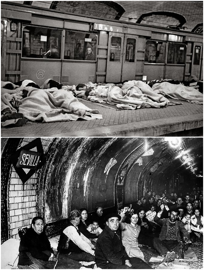 El Metro se convirtió así en un refugio antiaéreo improvisado. Su profundidad y la solidez de sus túneles ofrecían una protección relativa frente a las bombas, y para muchos ciudadanos era el único lugar donde sentirse a salvo. Las estaciones dejaron de ser simples puntos de paso para transformarse en espacios de convivencia forzada, miedo compartido y supervivencia cotidiana.
