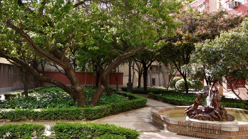 Uno de los muros que separan el huerto con el exterior, da hacia la Plaza de la Cruz Verde, donde encontramos la Fuente de Diana Cazadora.