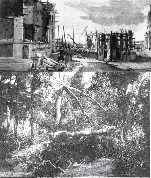 El tornado avanzó con rapidez hacia el centro de Madrid, arrasando Carabanchel Bajo, cruzando la Pradera de San Isidro y alcanzando zonas densamente pobladas. Las crónicas describen escenas sobrecogedoras: casas que se desplomaban en segundos, tejados arrancados y lanzados a gran distancia, carros volcados, árboles centenarios partidos como si fueran de papel. El viento rugía con una fuerza desconocida para los madrileños de la época.