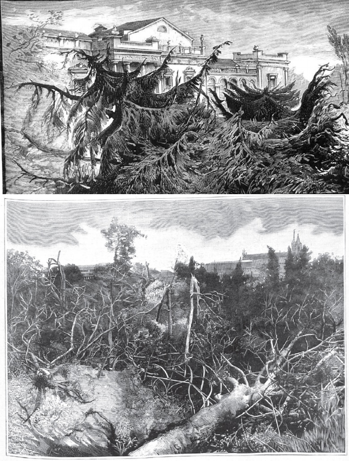 Uno de los episodios más trágicos ocurrió en el Lavadero Imperial, situado en el Paseo Imperial, donde trabajaban numerosas mujeres. La estructura no resistió la violencia del tornado y el derrumbe provocó un elevado número de víctimas mortales. En otros puntos de la ciudad, como la Puerta de Toledo, la calle de Segovia, Atocha, el Jardín Botánico o el Parque del Retiro, la devastación fue igualmente severa. Miles de árboles quedaron arrancados de raíz y numerosas edificaciones sufrieron daños irreparables.