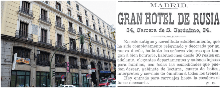 El edificio fue construido en 1866 y pocos años después abrió sus puertas como el Gran Hotel de Rusia, un alojamiento elegante y moderno, acorde con una ciudad que comenzaba a sacudirse definitivamente su aire decimonónico. En una época en la que Madrid empezaba a mirar a Europa con ambición, no resultaba extraño que hoteles, cafés y comercios adoptaran nombres extranjeros que evocaban modernidad, prestigio y cosmopolitismo. El Hotel Rusia se convirtió así en un punto de referencia para viajeros, artistas y burgueses, situado además en una de las arterias más vivas del centro histórico.