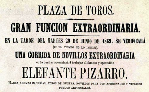 La tarde del espectáculo, los Campos Elíseos estaban a rebosar de un público vociferante que ansiaba divertirse con la barbarie. El caso es que la elefanta, conocida como Pizarro, no tenía el menor interés en hacer daño a los toros, y se negó a luchar. Por su parte, los astados, sabedores de que en una pelea tenían las de perder, se dedicaron a pasear silbando tranquilamente. La función fue un sonoro fracaso. A la vista de que Pizarro rechazaba los juegos violentos, al preclaro empresario se le ocurrió enseñarle a descorchar botellas de vino con la trompa y a beberse el contenido, cosa que provocaba grandes carcajadas en los espectadores.