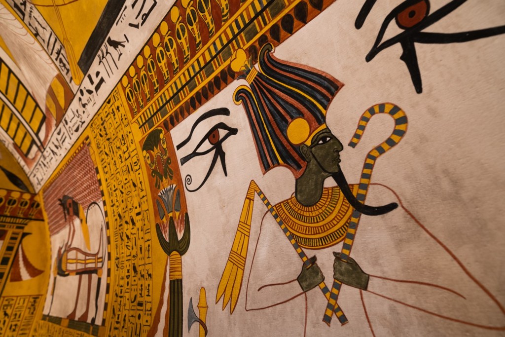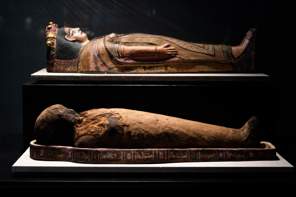 El visitante encontrará piezas de gran interés histórico y artístico: esculturas, relieves, documentos, objetos de la vida cotidiana, piezas numismáticas, utensilios domésticos, instrumentos musicales, joyas, objetos de uso religioso y funerario como ataúdes, cartonajes, amuletos, ushebtis, vasos canopos, etc. Todo ello acompañado de reproducciones a tamaño real de cámaras funerarias, como la tumba de Sennejdem, piezas tiflológicas y audiovisuales inmersivos, entre los que se encuentra una recreación de la cámara funeraria de la reina Nefertari. Además, habrá dos vestidos inspirados en el antiguo Egipto diseñados por Lorenzo Caprile.