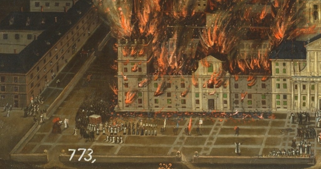 El Monasterio del Escorial ha sufrido varios incendios a lo largo de su historia siendo el más famoso el de 1671. Gracias a la impresionante imágen anónima que ha llegado hasta nuestros días es suficiente para hacernos una idea de la gravedad de este episodio histórico.