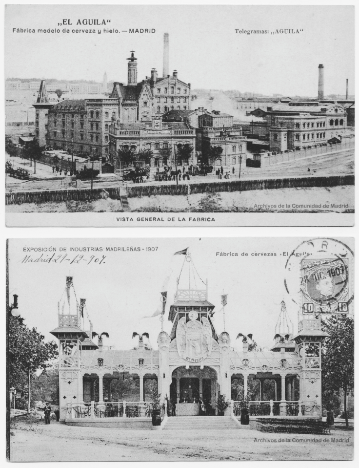 La historia de El Águila comienza a finales del siglo XIX, en un momento en el que Madrid empezaba a industrializarse y a mirar hacia Europa. En 1900 se constituyó la sociedad cervecera que daría nombre a la fábrica, impulsada por el empresario Augusto Comas y Blanco. Poco después, en 1903, la cerveza El Águila comenzó a comercializarse, convirtiéndose en una de las primeras marcas modernas en un país donde el vino seguía siendo la bebida predominante. El éxito del producto hizo necesaria la construcción de una gran factoría que centralizara la producción.