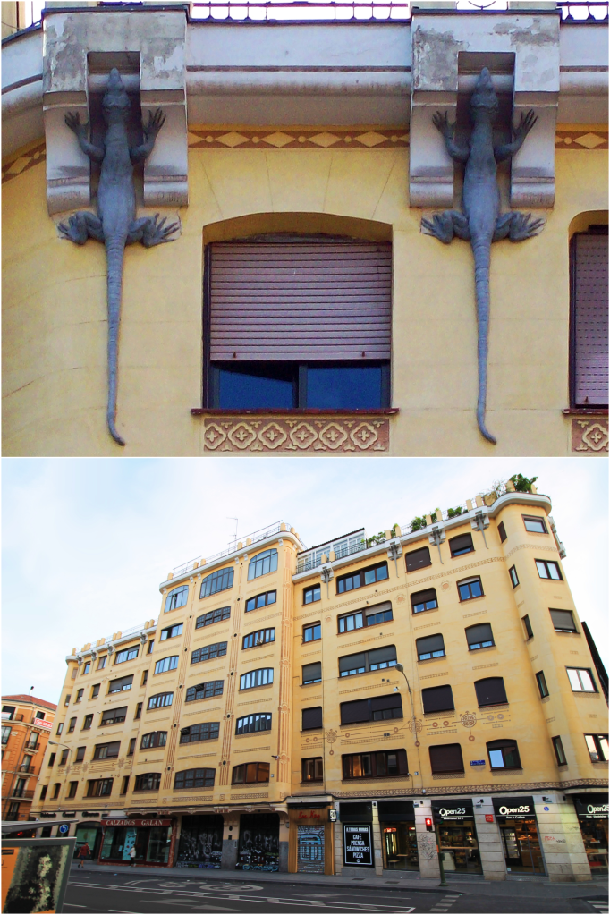 En el número 1 de la calle Mejía Lequerica, en pleno barrio de Justicia, hay un edificio que pasa desapercibido para muchos madrileños… hasta que alguien levanta la vista. Entonces aparecen ellos: los famosos “lagartos” que trepan por su cornisa y que han dado nombre popular a una de las construcciones más singulares del Madrid de principios del siglo XX.