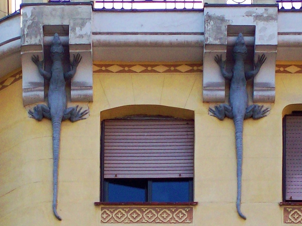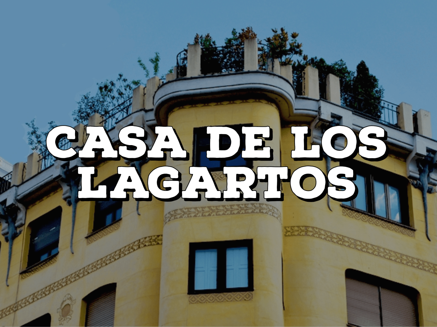 Proyecto y obra de Benito González del Valle y Fernández-Galán, este edificio es de las pocas muestras de arquitectura modernista y de influencia de la Secesión de Viena que existen en Madrid. Su curioso nombre procede de unas esculturas con forma de lagarto que adornan y sustentan la cornisa de la fachada del edificio. Personalmente me parecen más unas salamandras no sólo por su forma sino también porque trepan las paredes y habitan en los tejados.