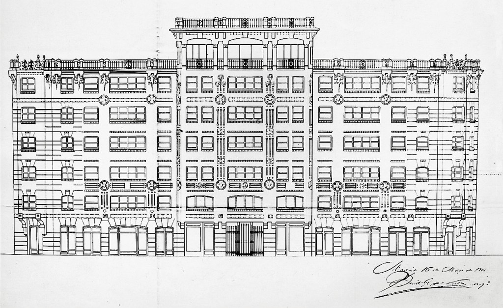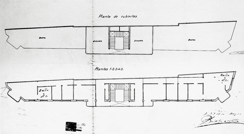 Fue construido en 1912 y estaba proyectado para viviendas de alquiler. Su arquitectura engaña desde el exterior, ya que tiene una planta muy estrecha, con mucha fachada y poco fondo. De hecho, es once veces más largo que ancho. El truco óptico se puede descubrir desde la esquina de Mejía Lequerica con San Mateo, contando con sólo cinco metros de ancho. Por su peculiar diseño, estrecho y alargado, sólo se pudieron construir dos viviendas por planta con la escalera en el centro del edificio.