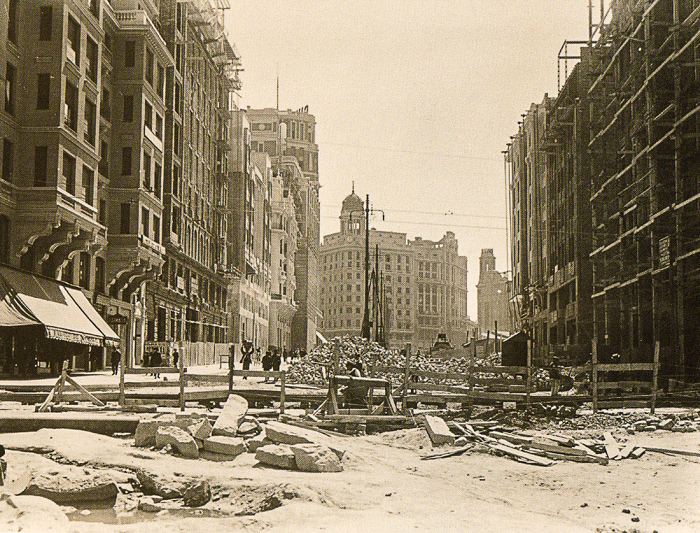 La construcción de la Gran Vía comenzó en 1910 y el primer edificio en ser inaugurado, en 1917, fue el número 8, en la esquina con la calle de Víctor Hugo, donde ahora está la tienda de Loewe en la planta baja. El último en ser construido fue el Hotel Washington, en el número 72, en 1954.