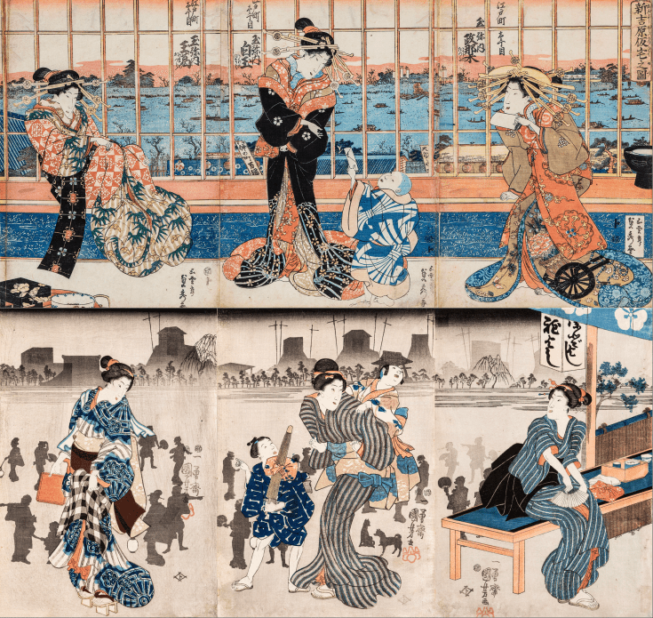 El ukiyo-e, cuyo significado puede traducirse como “imágenes del mundo flotante”, nació en el Japón urbano de los siglos XVII al XIX como reflejo de una sociedad que celebraba el placer del instante: el teatro, la moda, la naturaleza cambiante o la figura femenina idealizada. En ese contexto floreció el género bijin-ga, protagonista absoluto de esta exposición, centrado en la representación de mujeres elegantes, etéreas y atemporales, más cercanas a un ideal estético que al retrato individual.
